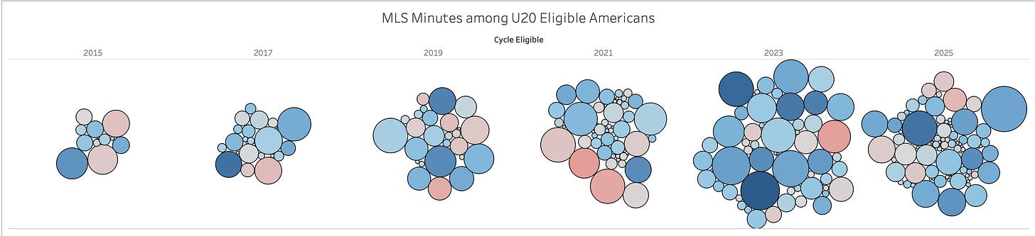 Since that time, the number of professional players eligible for the U20 World Cup has taken off. So far, 2025 is a slight decrease from 2023, but the gates have been opened and there’s no slowing down now. The addition of MLS Next Pro, where young players can continue to sharpen in professional environments and experience an easier transition to the next level, means that even the U17s will broadly be professionalized in the future.