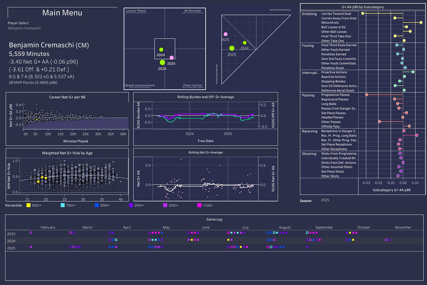 Gozo is the youngest of the attackers, but is in excellent form for Real Salt Lake - most recently demonstrated with a beautiful bicycle kick goal in a losing effort vs LAFC. He’s another pacey runner, putting up an amazing +0.04 G+ per 96 on progressive long balls alone. He’s peaking at the right time to be a difference maker on this squad.