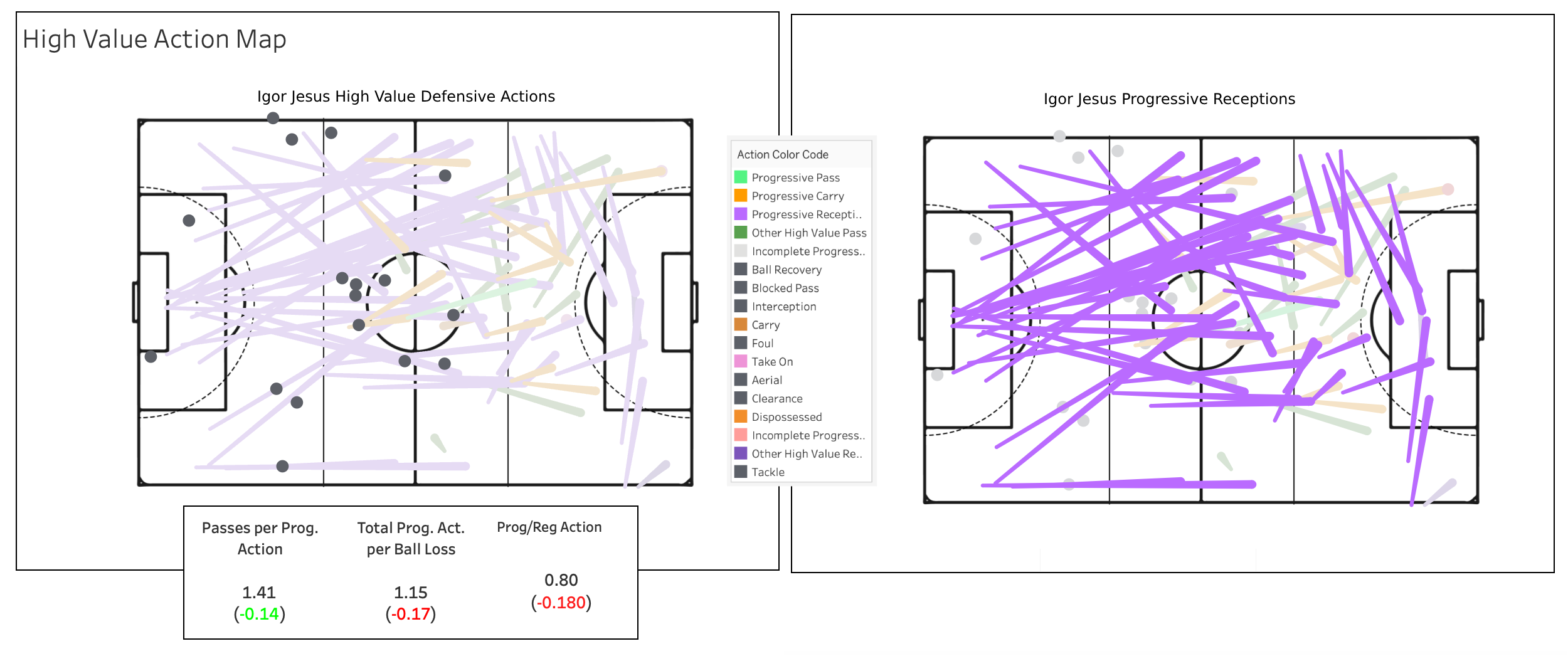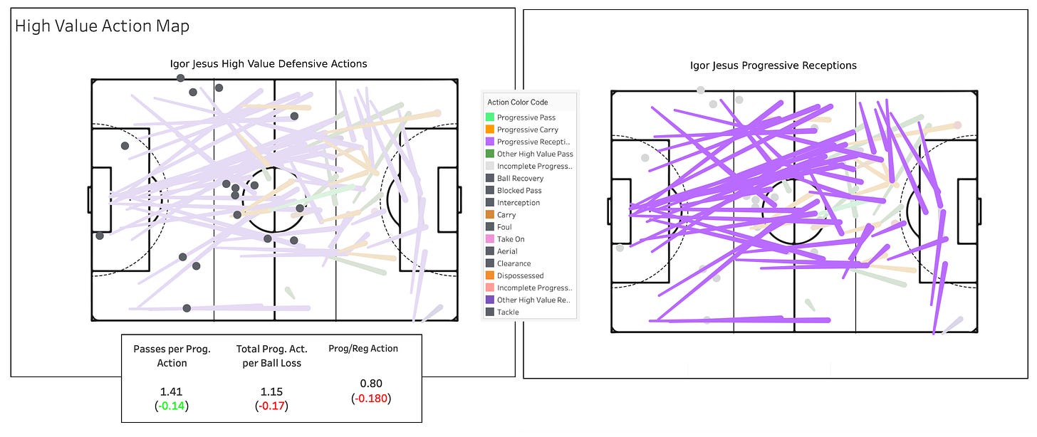 Igor Jesus comfortably led strikers in both high value interrupting actions as well as progressive receptions. It’s notable a lot of these progressive receptions aren’t in the box; although he’s more than happy to help out in the buildup to establish a beachhead in the attacking third, he’s not the one finishing off the chances for his Botafogo side. It’s a different approach to adding value that might work in an interesting way for the Nottingham Forest side he has already agreed to join.