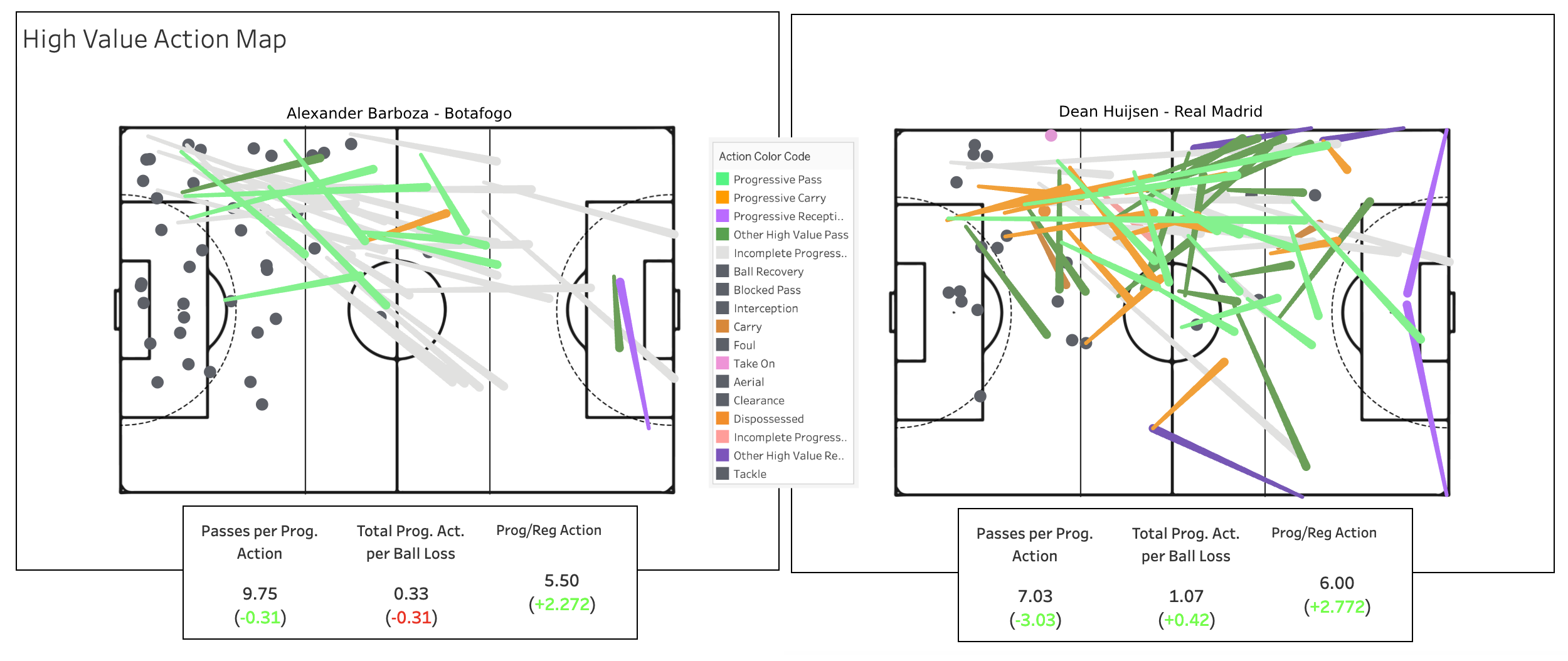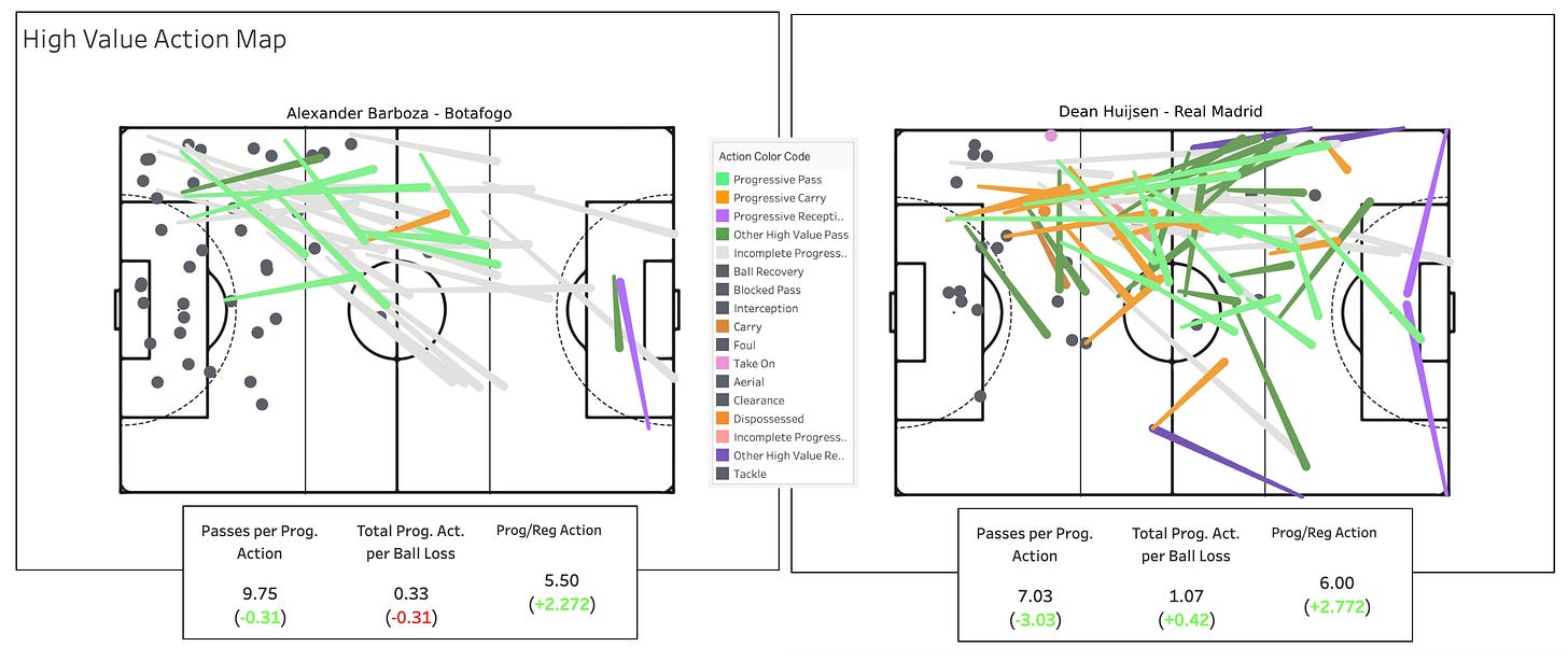 The Dog CB (or dawg if you prefer) is Alexander Barboza. He was everywhere as a defender, locking down Botafogo’s left side. He racked up the most high value defensive actions (>0.005 G+) and then mostly spent hist time on the ball time launching the ball into the opponent half, sometimes successfully but usually not.