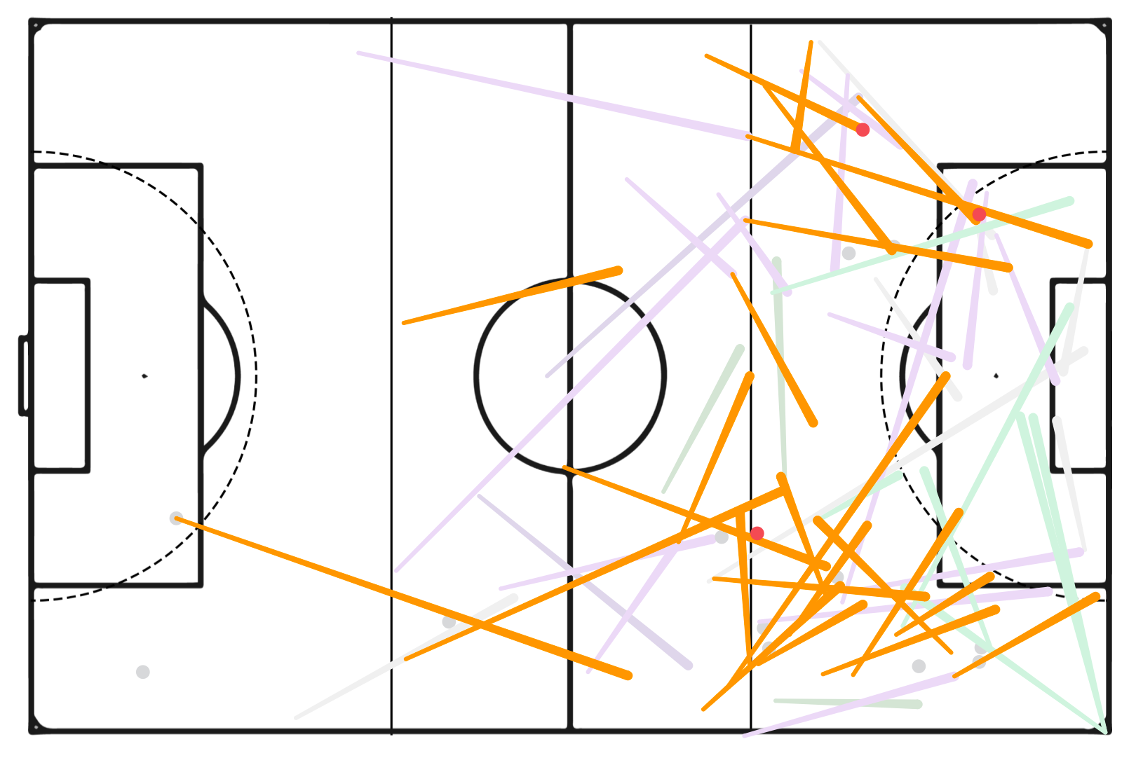 Estêvão is my current pick for young player of the tournament. The 18 year old, soon to be a member of the Chelsea squad, is a terror on the dribble. He has the “take on” meter cranked up to 11, and was a constant threat to back lines due to his aggressive ball carrying. He converted his carrying to chances as well, with 1.7 xG+xA. Check out this map of his progressive carries and take ons: