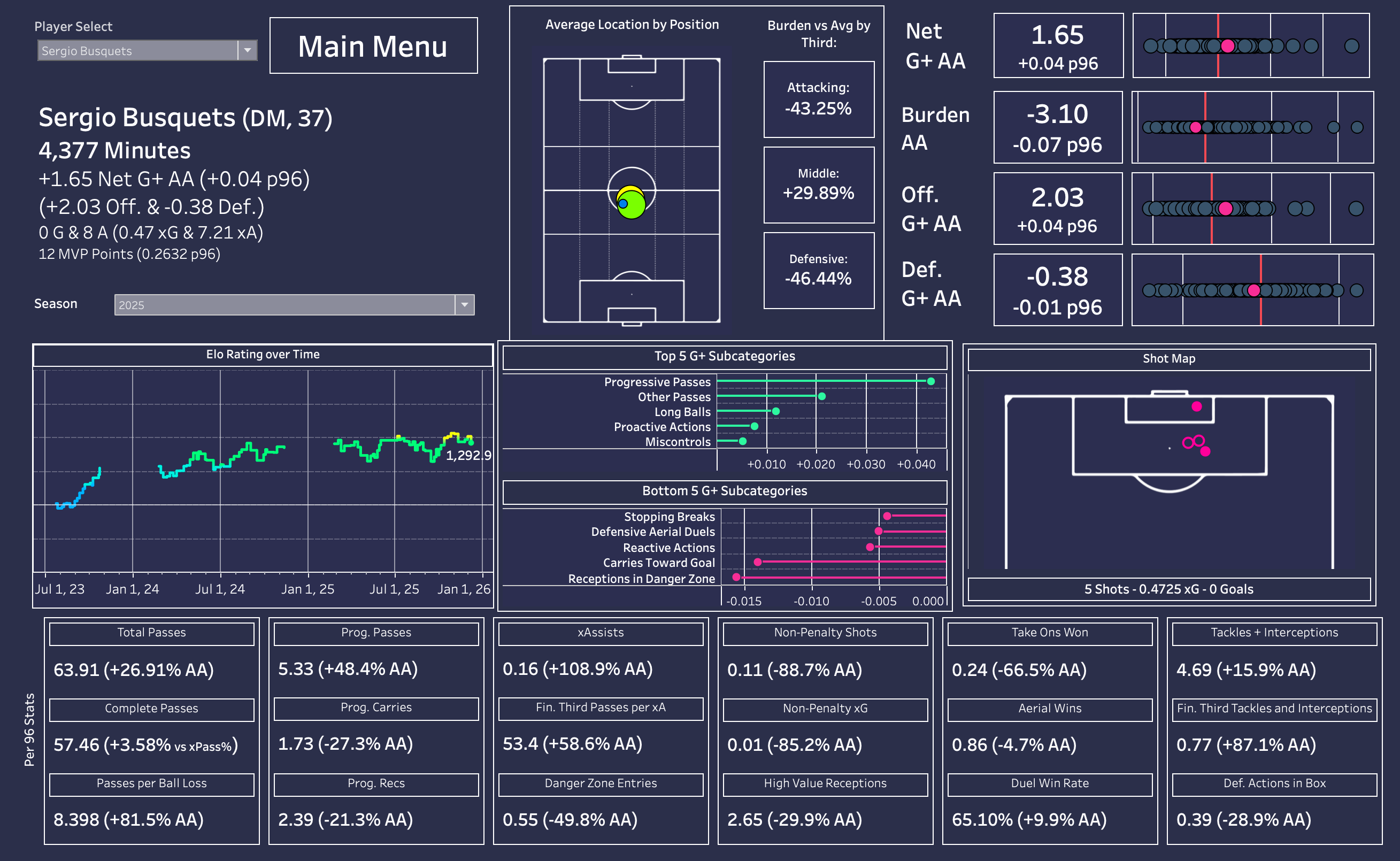 Inter Miami in 2025 was a team that had extremely high offensive efficiency (because they had really good chance creators) and fairly high in tilt (because they had good ball progressors, which both increases your own tilt and lowers your opponents). Defensively, they were fairly strong in tilt (again, see the impact of ball progressors) but a little weak in defensive efficiency. This is probably because all their money went to attackers.